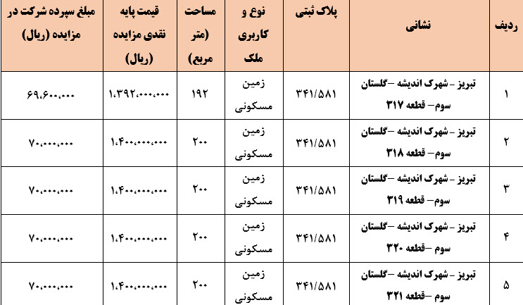 اداره کل راه و شهرسازی استان آذربایجان شرقی به نمایندگی از شرکت بازآفرینی شهری ایران در نظر دارد، پنج قطعه زمین در شهرک اندیشه تبریز را از طریق مزایده عمومی با شرایط پرداخت "نقد " و "نقد و اقساط" به فروش برساند.