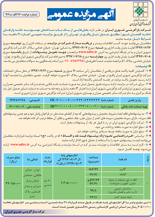 به گزارش روابط عمومی شرکت بازآفرینی شهری ایران، متقاضیان می توانند برای کسب اطلاعات بیشتر و دریافت مدارک شرکت در مزایده، در ساعات اداری از روز دوشنبه مورخ 26/06/1397 تا پایان وقت اداری روز شنبه مورخ 07/07/1397 و برای تحویل پیشنهادات خود، از تاریخ یکشنبه مورخ 08/07/1397 تا پایان وقت اداری روز چهارشنبه مورخ 18/07/1397 به دبیرخانه شرکت بازآفرینی شهری ایران به نشانی تهران، خیابان خدامی، پلاک 51، شرکت بازآفرینی شهری ایران مراجعه کنند.