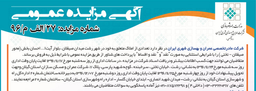 شرکت مادر تخصصی عمران وبهسازی شهری ایران در نظر دارد تعدادی از املاک متعلق به خود در شهر رشت میدان صیقلان ، بلوار آیت الله احسان بخش ( محور صیقلان – تختی) را با شرایطی استثنایی به صورت نقد و نقد و اقساط با پرداختهای شناور از طریق مزایده عمومی با شرایط ذیل به فروش برساند .