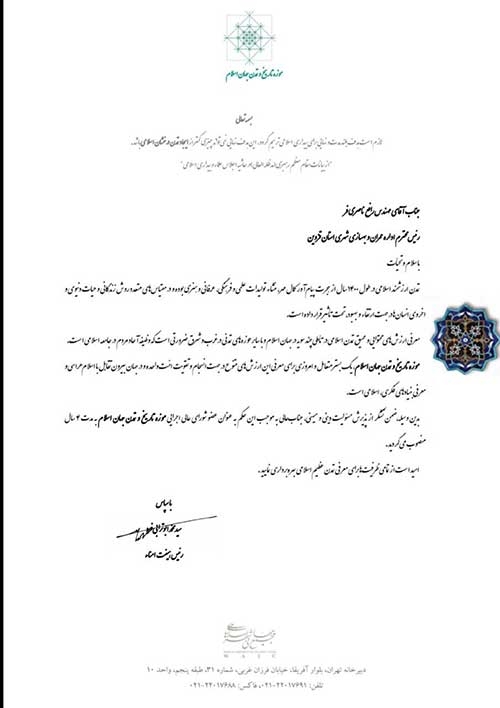 با حکم حجت الاسلام و المسلمین ابوترابی فرد رییس هیات امنا موزه ورییس هیات حل اختلاف سه قوه دفتر مقام معظم رهبری مهندس رافع ناصری فر رییس اداره عمران و بهسازی شهری استان قزوین به عنوان عضوشورای عالی اجرایی موزه تاریخ تمدن جهان اسلام منصوب شد.