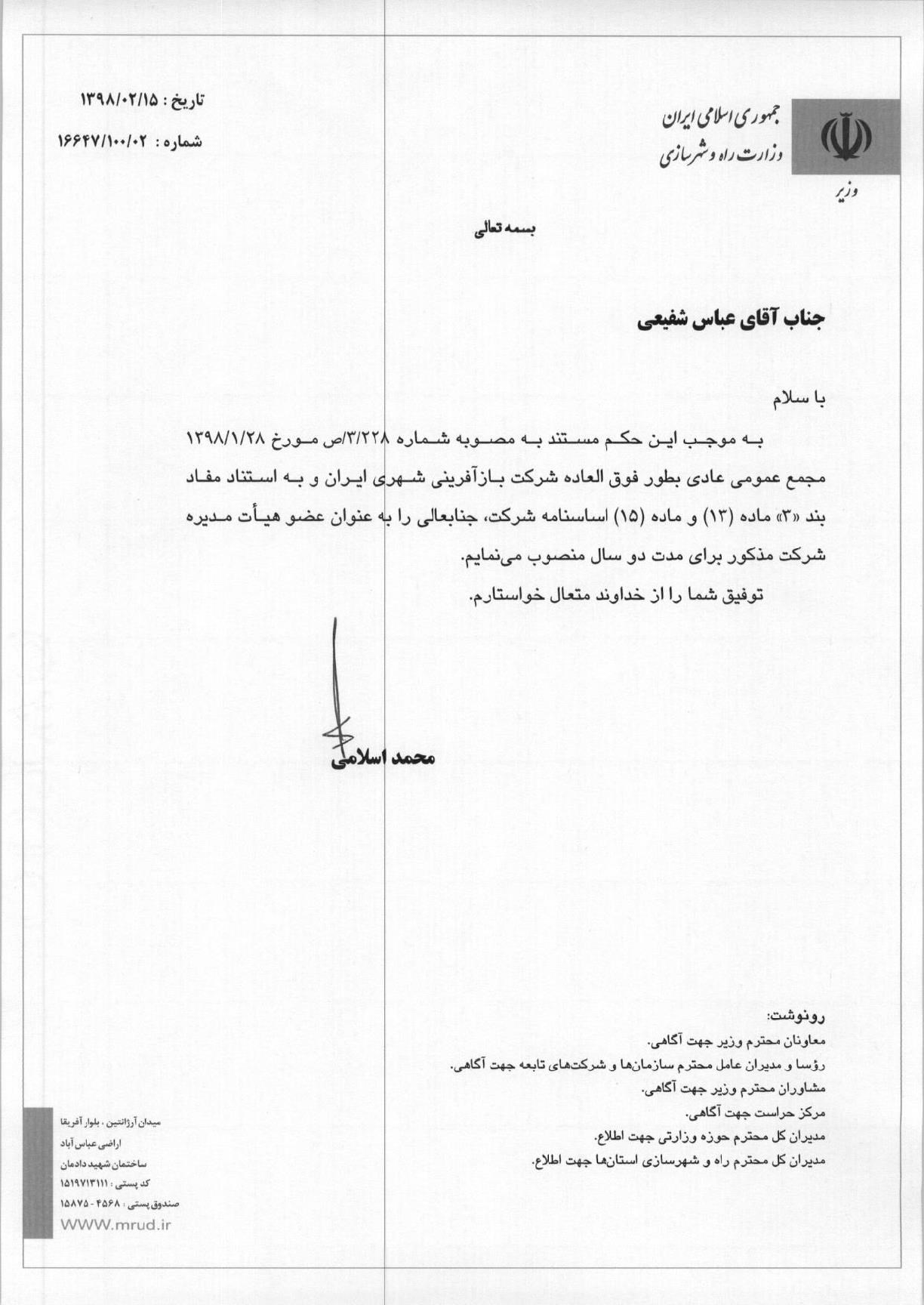 به موجب این حکم مستند به مصوبه شماره 228/3/ص مورخ 1398/1/28 مجمع عمومی عادی بطور فوقالعاده شرکت بازآفرینی شهری ایران و به استناد مفاد بند "3" ماده (13) و ماده (15) اساسنامه شرکت، جنابعالی را به عنوان عضو هیئتمدیره شرکت مذکور برای مدت 2 سال منصوب می نمایم. توفیق شما را از خداوند متعال خواستارم.