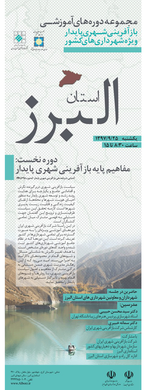 دوره آموزشی بازآفرینی شهری پایدار ویژه شهرداریهای استان البرز، روز یکشنبه 25 آذر ماه جاری در محل استانداری برگزار می شود.