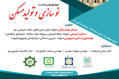 گفتنی است، در این نشست موضوعاتی نظیر، مسکن همسایگی( نمونه: بنای میان افزایی بافت تاریخی یزد) مسکن تدریجی( نمونه: ارتقاء تدریجی سر پناه خود ساخته نیشابور – زاهدان) و نهادسازی مسکن محرومین( نمونه: خیرین مسکن ساز مشهد) توسط مدرسین: آقایان مجتبی فرهمند، مهرداد بهمنی، محمد سالاری راد و غلامرضا بصیری پور ارائه می گردد.