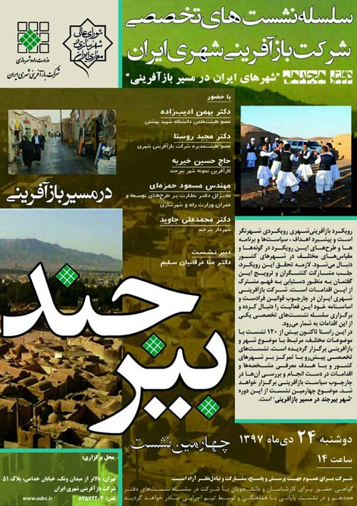 به گزارش روابط عمومی شرکت بازآفرینی شهری ایران، چهارمین نشست از دفتر هجدهم سلسله نشست های تخصصی شرکت بازآفرینی شهری ایران با موضوع "بیرجند در مسیر بازآفرینی" روز دوشنبه 24 دی ماه برگزار میشود.