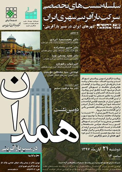 به گزارش روابط عمومی شرکت بازآفرینی شهری ایران، دومین نشست از سلسله نشست های دفتر هجدهم با موضوع "همدان در مسیر بازآفرینی" دوشنبه، 21 آبان ماه جاری از ساعت 14 به همت شرکت بازآفرینی شهری ایران برگزار می شود.