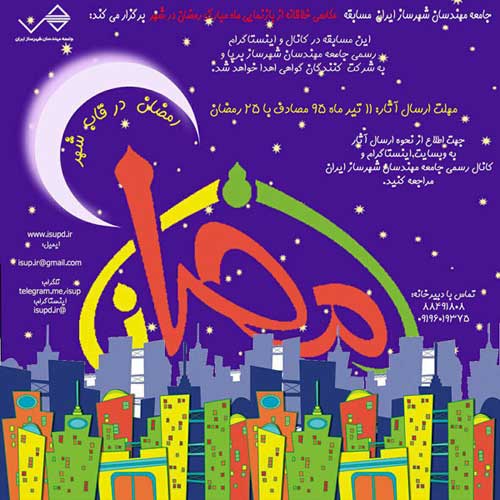 جامعه مهندسان شهرساز ايران با هدف بازنمایی ماه مبارک رمضان در شهرهای سراسر کشور اقدام به برگزاری مسابقهای تحت عنوان «مسابقه عكاسی رمضان در قاب شهر» کرده است.