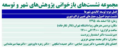 از سلسله نشست های تخصصی بازخوانی پژوهش های شهر و توسعه؛ نشست دوم با موضوع " اصول و معیارهای تعیین تراکم شهری " در روز پانزدهم اسفند ماه جاری از ساعت 14 الی 17در محل تالار نگار خانه پردیس هنرهای زیبا دانشگاه تهران برگزار می شود .