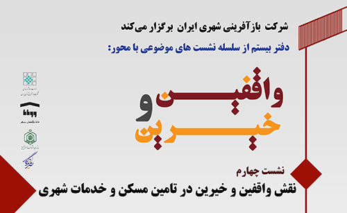 نشست چهارم از دفتر بیستم سلسله نشستهای تخصصی موضوعی با محور "واقفین و خیرین" با عنوان " نقش واقفین و خیرین در تأمین مسکن و خدمات شهری"در روزر شنبه مورخ 20. 07 .98 ساختمان وارطان برگزار می شود.