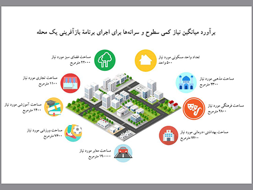 وی ادامه داد: یک محله را با 500 واحد مسکونی در نظر بگیرید که در بافت فرسوده، بافت میانی شهری یا در بخش غیررسمی حاشیه‌ای باشد قرار دارد و تخریب شده است. این محله حدود دو هزار نفر جمعیت دارد و باید نیازهای ساکنان آن شناسایی شود. به عنوان مثال، این 500 واحد مسکونی به 2300 متر فضای مذهبی، 3800 به فضای فرهنگی، فضای بهداشتی 7700 متر، مساحت معابر مورد نیاز 190 هزار متر نیاز دارد؛ اگر این مورد از نظر شماتیک در نظر گرفته شود، اهمیت آن در نگاه خرد و نگاه کلان برای ما مهم است.(اینفوگرافیک شماره یک)