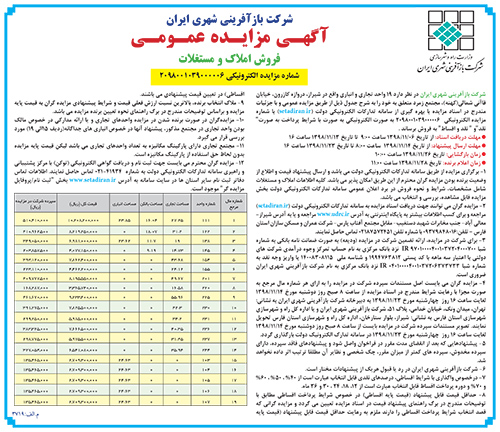شرکت بازآفرینی شهری ایران در نظر دارد 19 واحد تجاری و انباری واقع در شیراز، دروازه کازرون، خیابان قاآنی شمالی(کهنه)، مجتمع زمرد متعلق به خود را به شرح جدول ذیل از طریق مزایده عمومی و با جزئیات مندرج در اسناد مزایده با بهره گیری از سامانه تدارکات الکترونیکی دولت (setadiran.ir) با شماره مزایده الکترونیکی  ۲۰۹۸۰۰۱۰۳۹۰۰۰۰۰۶ به صورت الکترونیکی به صورت با شرایط پرداخت به صورت" نقد"و " نقد و اقساط" به فروش برساند .
