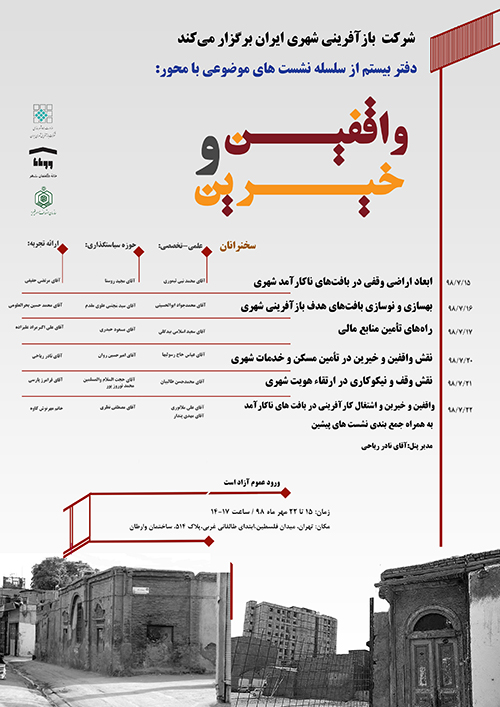 به گزارش روابط عمومی شرکت بازآفرینی شهری ایران، سلسله نشست‌های تخصصی- موضوعی دفتر بیستم با محور "واقفین و خیرین" و با تأکید بر نقش اراضی وقفی در تأمین مسکن اقشار کم درآمد برگزار می شود.