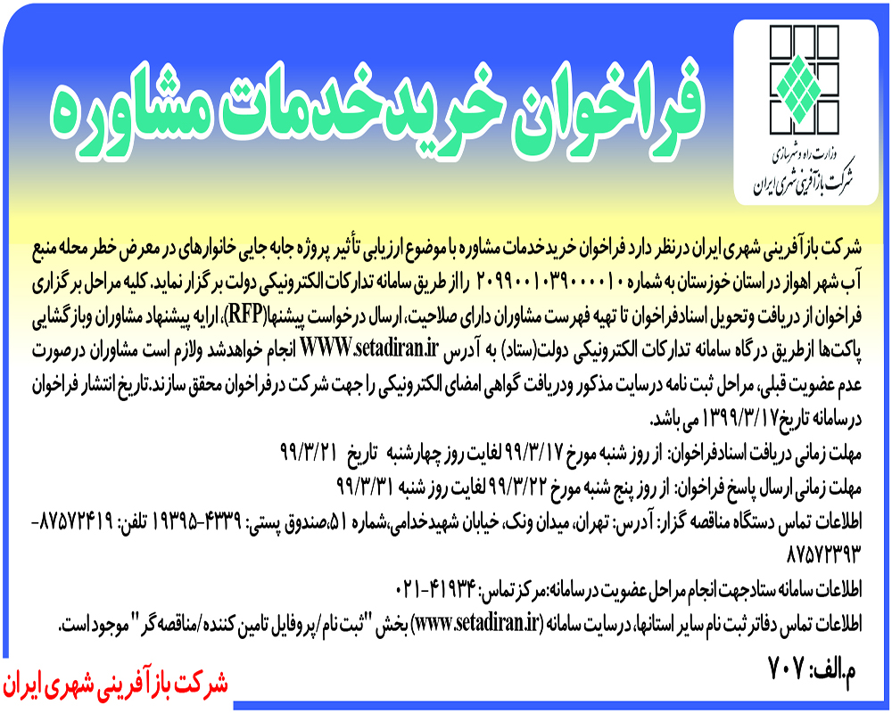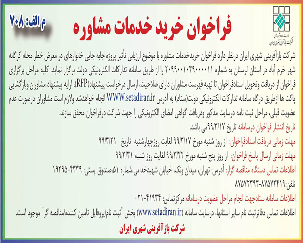 شرکت بازآفرینی شهری ایران در نظر دارد، خرید خدمات مشاوره با موضوع ارزیابی تأثیر پروژه جابه جایی خانوارهای در معرض خطر محله کرگانه شهر خرم آباد و محله منبع آب شهر اهواز در استان های لرستان و خوزستان را از طریق فراخوان در سامانه تدارکات الکترونیکی دولت (ستاد ایران) برگزار نماید.