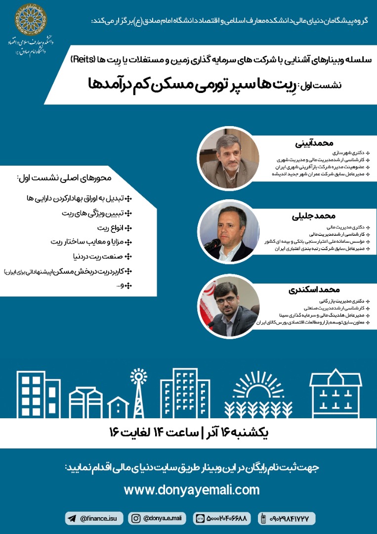 وبینار ریت ها سپر تورمی نشست اول از سلسله وبینار‌های آشنایی با شرکت‌های سرمایه‌گذاری زمین و مستغلات یا ریت‌ها(reits ) روز یکشنبه ۱۶ آذر ماه ساعت ۱۴ با عنوان "ریت‌ها سپر تورمی مسکن کم درآمد‌ها" برگزارخواهد شد.